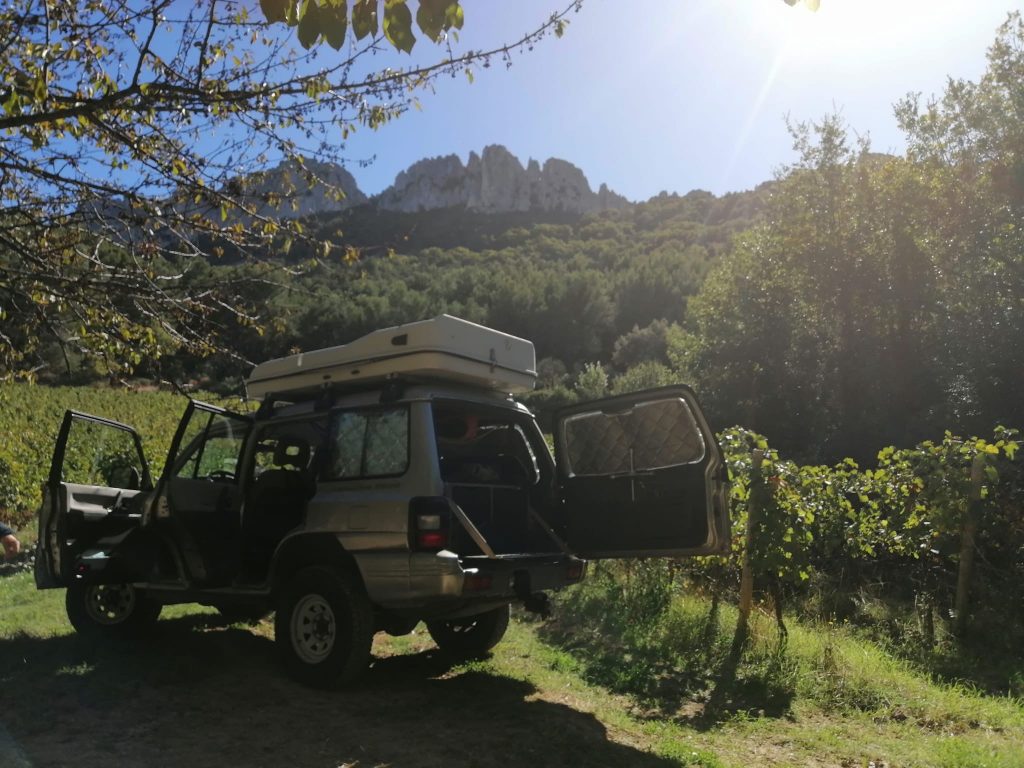 Le dégustation est terminée, direction le col du Cayron, au pied des Dentelles de Montmirail, où nous installerons notre camp de base pour le pique-nique.