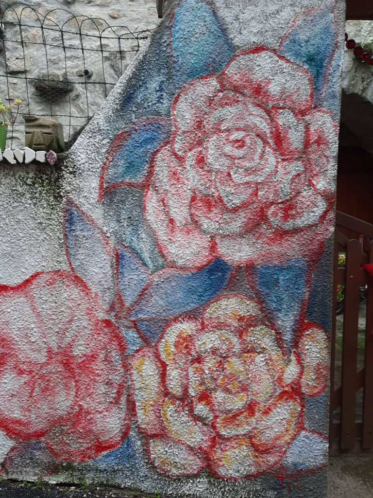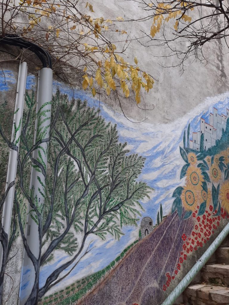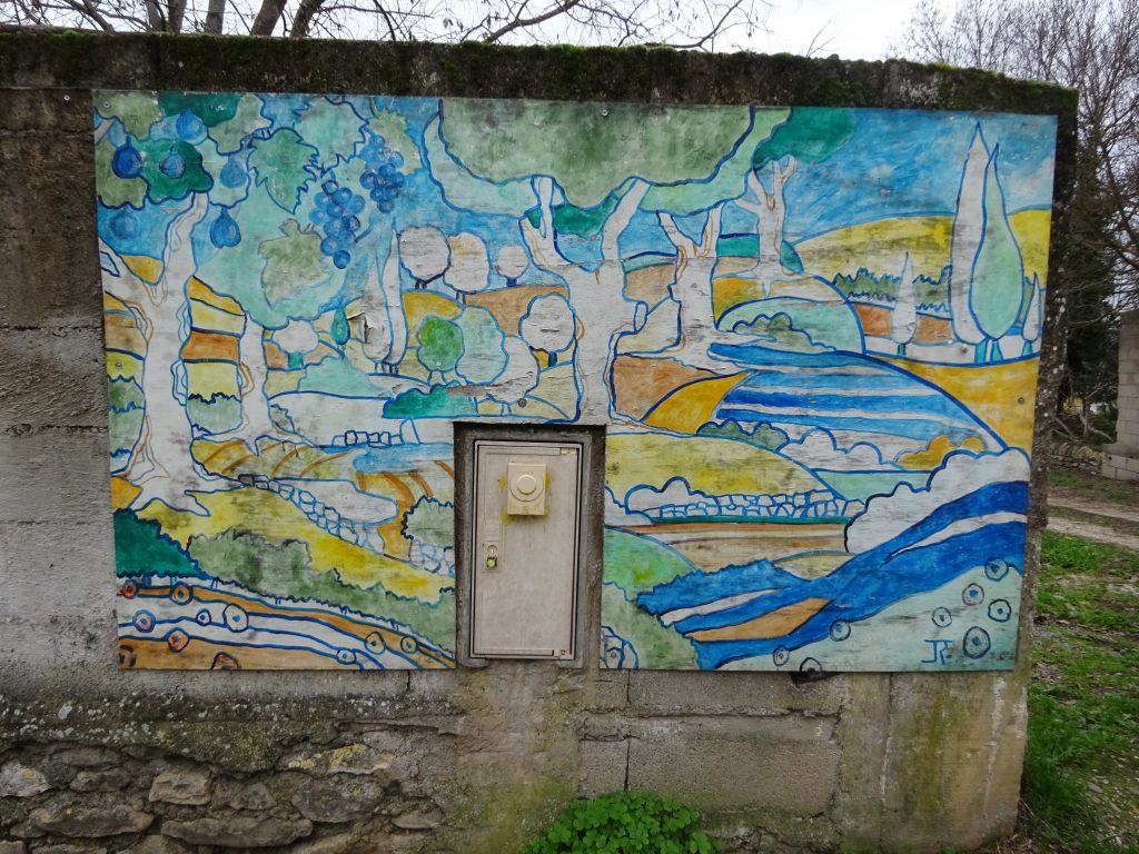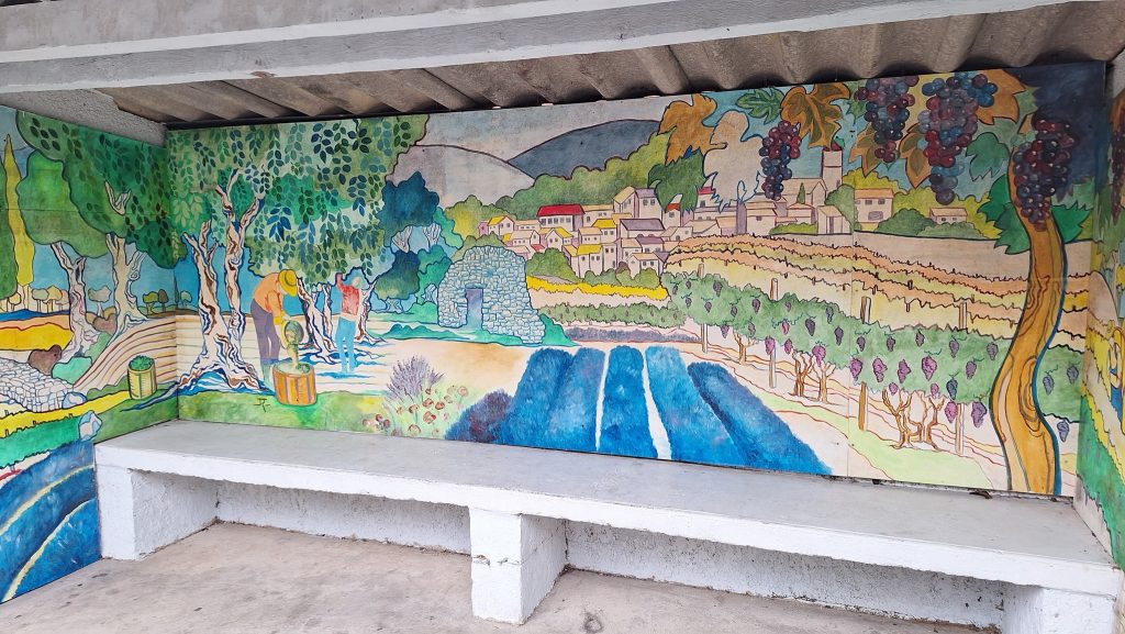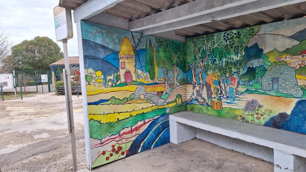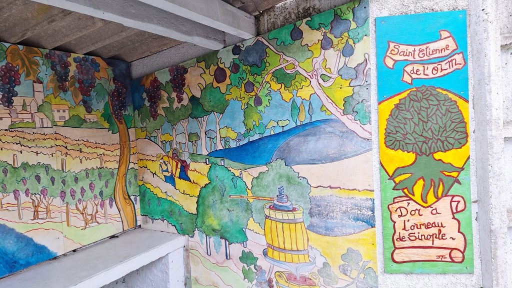 L’ Art au détour des rues de St Etienne de l’Olm. Les peintures murales ornent certaines façades, abribus et apportent couleur et personnalité au village.