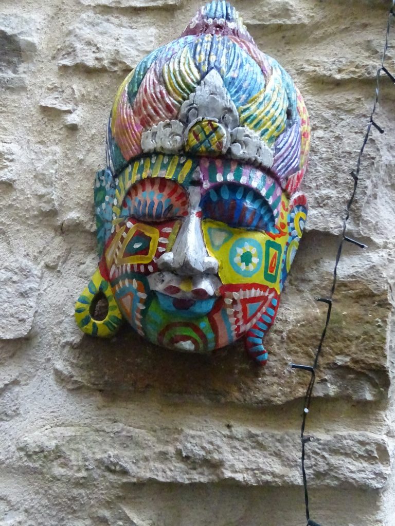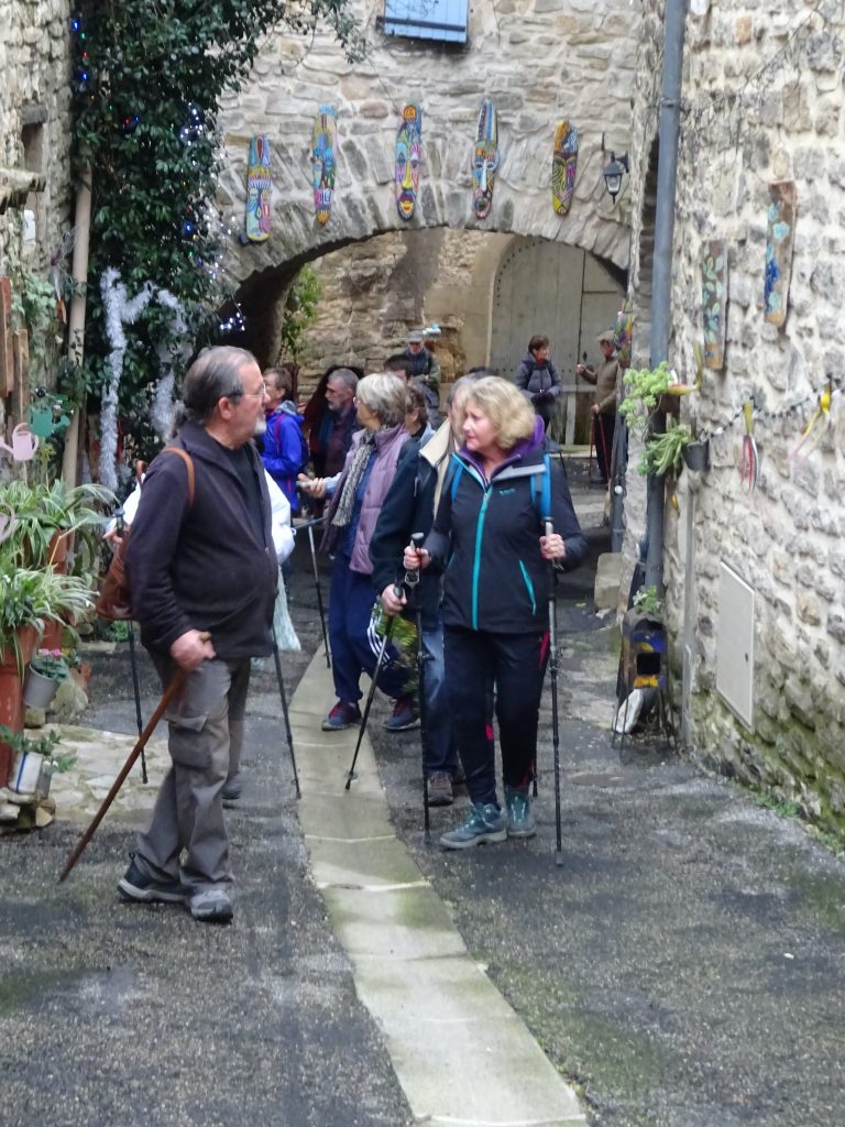 Nos randonneurs admirent les masques sur les murs et au-dessus de porche