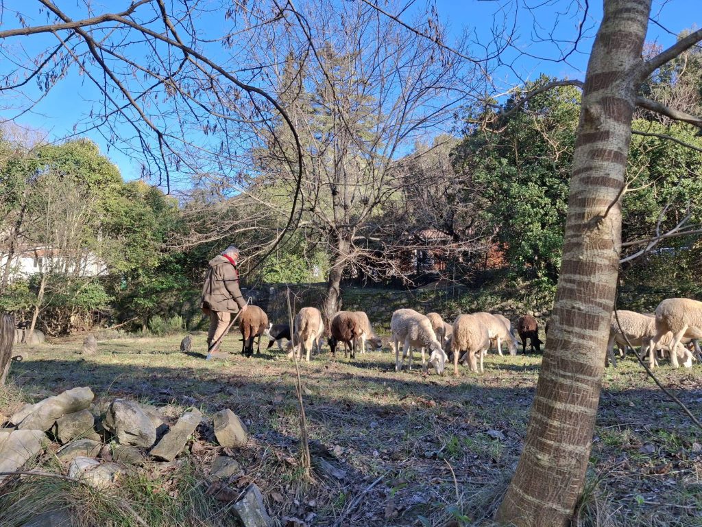 Moment fort de cette randonnée la rencontre inattendue avec un berger et son troupeau de moutons. Une scène simple et émouvante, digne d’une carte postale des Cévennes .Cette belle image a rappelé la vie rurale encore bien vivante dans ces vallées.