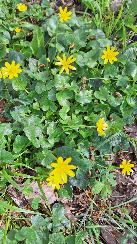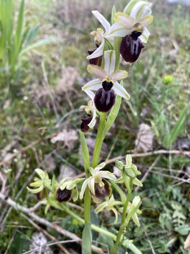Sur notre chemin un beau parterre de fleurs blanches au milieu des rangées de vignes , nous avons aussi vu beaucoup d’orchidées sauvages, des jonquilles et plein d’autres fleurs .