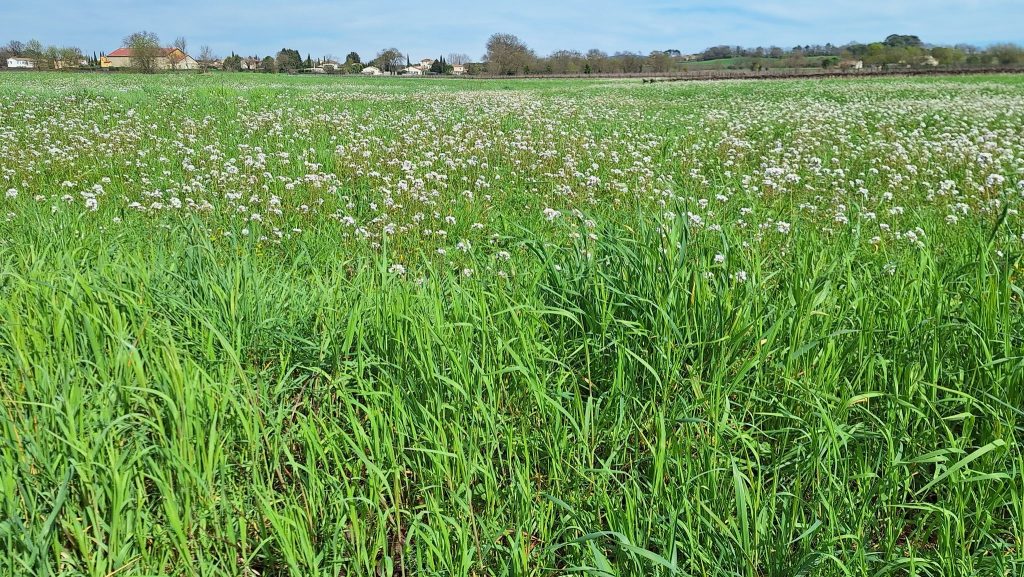Magnifique champs verdoyant parsemé de fleurs blanches.