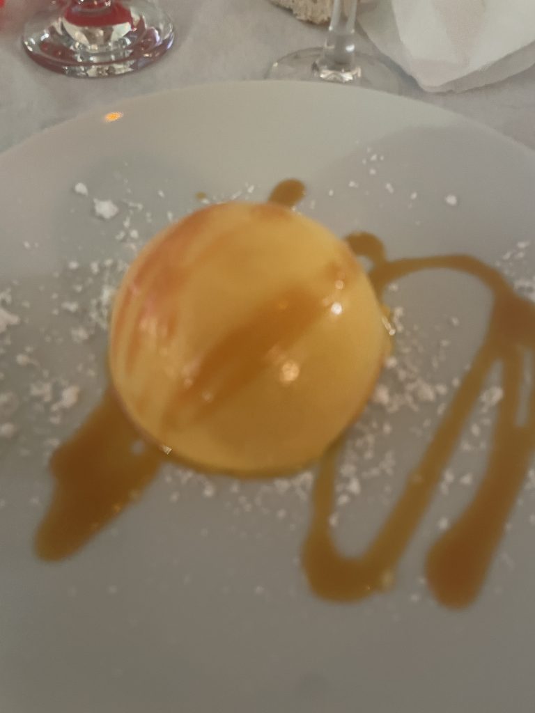 Un dessert excellent » Dôme impératrice » mousse mangue passion, biscuit Joconde, glaçage jaune, décor noir de coco et poudre de cacao.